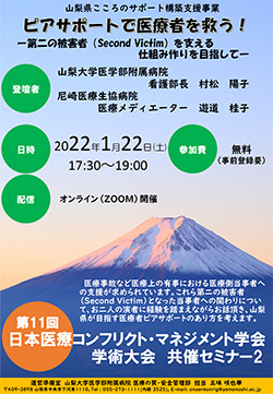 「医療事故など医療における有事に遭遇した医療側当事者は、その悪しき結果に対して、悲嘆や恥、恐怖などの感情や自責の念を抱えて孤立してしまうことがあります。こうした医療側当事者は「第二の被害者(Second Victim)」と呼ばれ、適切なケアが提供されないと、不眠や慢性疲労の原因となったり、薬物乱用などの著しく健康状態を害する状態を招来したりする恐れがあります。また、これらの心身の不調は、休職や退職にもつながることが懸念され、個人はもちろん、組織にとっても大きな痛手となります。こうした「第二の被害者」に対するケアとして期待されているのが「ピアサポート」です。ピアとは仲間を意味しており、医療側当事者においては、同僚などの同じ立場を持つ者や、似たような経験を持つ者がピア(仲間)に該当します。ピアサポートの仕組みは、主に米国で先行して取り組みが行われていますが、日本でも取り組みが徐々に広がりつつあります。山梨大学医学部附属病院の医療の質・安全管理部では、山梨県から「こころのサポート構築支援事業」の補助金を受けて、山梨県内全体に医療従事者のためのピアサポートの仕組みを構築すべく、2020年から活動を開始しました。今回の研修会では、医療事故当事者に対するピアサポートを提供してきた経験を持つ山梨大学医学部附属病院の看護部長をお迎えし、医療メディエーターとして活躍されている遊道桂子さんとともに、貴重な体験をお伺いし、ピアサポートのあり方を考えて行きます」